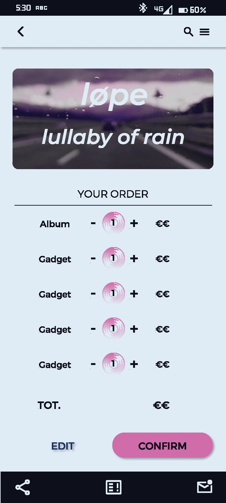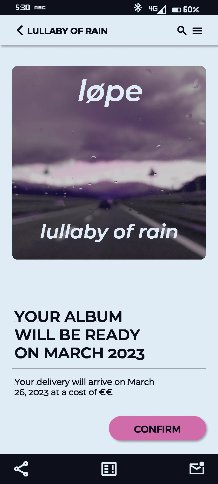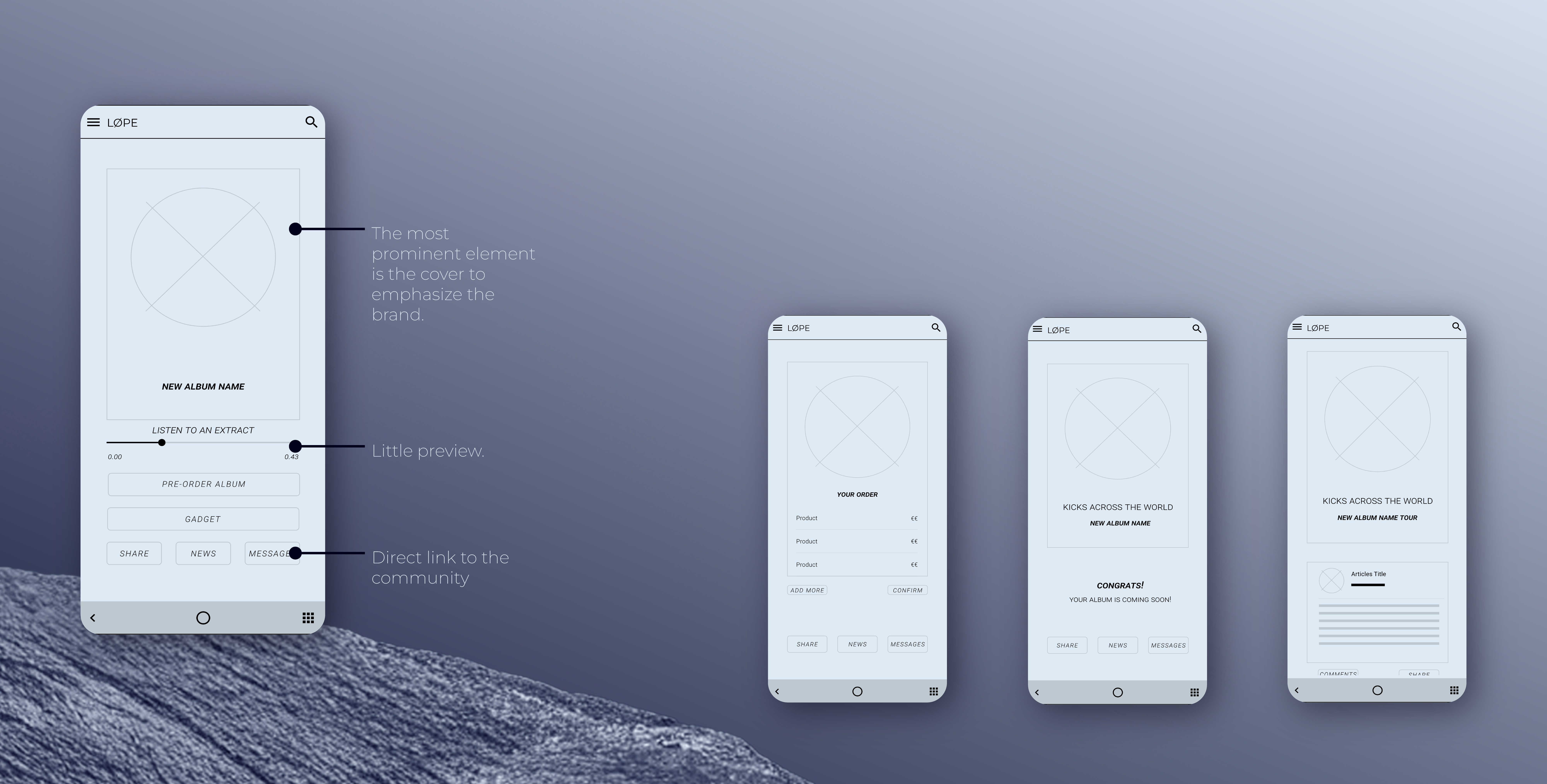 The general idea is to have a page with very few elements. Although the main components should be more visible, I would like the album cover to be featured as a full background whenever possible, maintaining the visual identity of the band and reinforcing the brand's image.